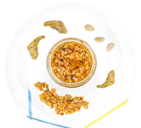 Not your usual artichoke pâté! The Carciofata Tasting Sicily is a whirlwind of flavors that reflects Sicilian cuisine in all its nuances. The strong taste of the artichokes is softened by the flavor of grilled zucchini, almonds, and sun-dried tomatoes, making this pâté one of a kind.